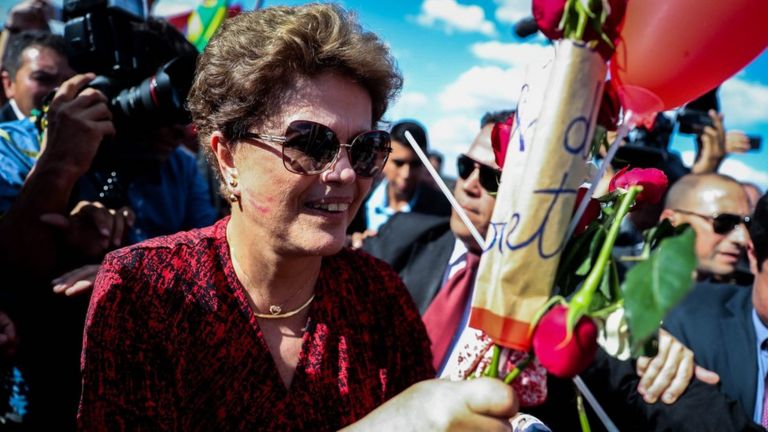Brazilian television showed Ms Rousseff walking out of the presidential residence surrounded by former ministers and Congressmen from her Workers' Party.